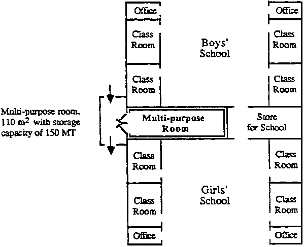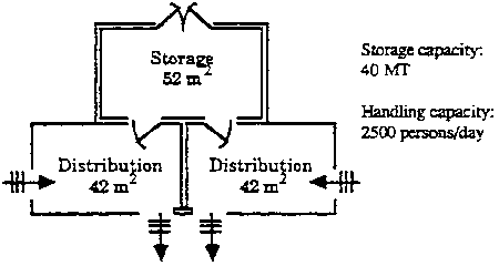 7.2.9 For distribution centres in refugee camps, study the feasibility of constructing a multi-purpose building or integrating a secure storage room into other refugee community facilities, such as a school, workshop, office or feeding unit. Where goods may only be stored for a few days each month, the centre can be used for other purposes during its non-storage period, thereby becoming pan of the social infrastructure within the camp.