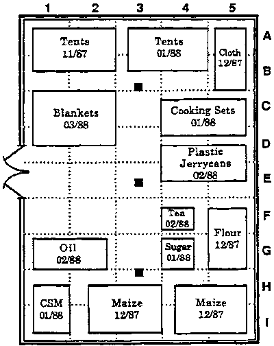 7.1.4 At the national or regional level, UNHCR offices should maintain a central inventory of storage facilities currently used to hold UNHCR supplies and food aid. Review storage requirements at least annually, to assess anticipated needs and available facilities, and to make budgetary provisions for repairs, equipment and personnel. A record for each storage unit should indicate: