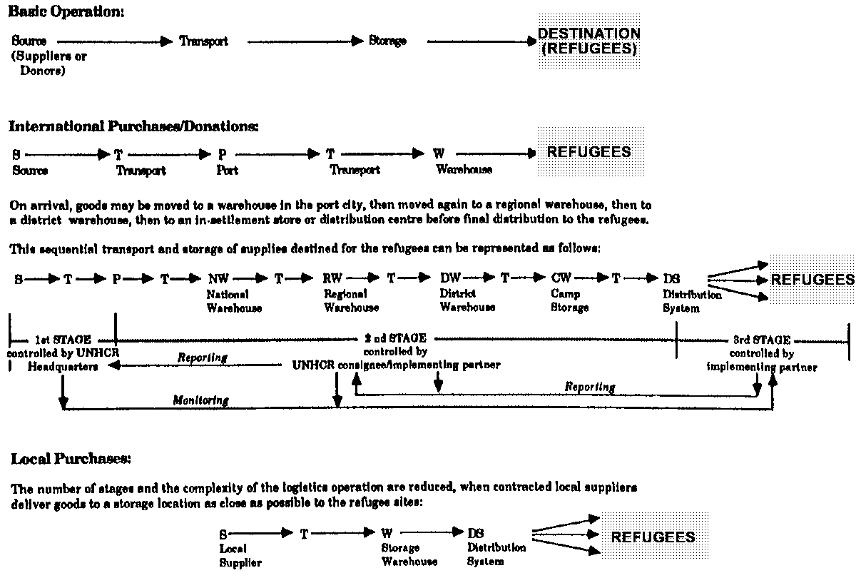 5.1.1 Logistics is the practical art of supplying material support to a defined group of beneficiaries. UNHCR's sources of material assistance for refugee programmes are suppliers and donors. Supplies and food aid must then be delivered to the refugees who are often located in remote geographic areas. Local transportation and communication infrastructures may have to be reinforced and processes for control and information feedback must be introduced, to ensure that the material assistance from the source reaches the refugees at the destination, in the quantity and quality provided.