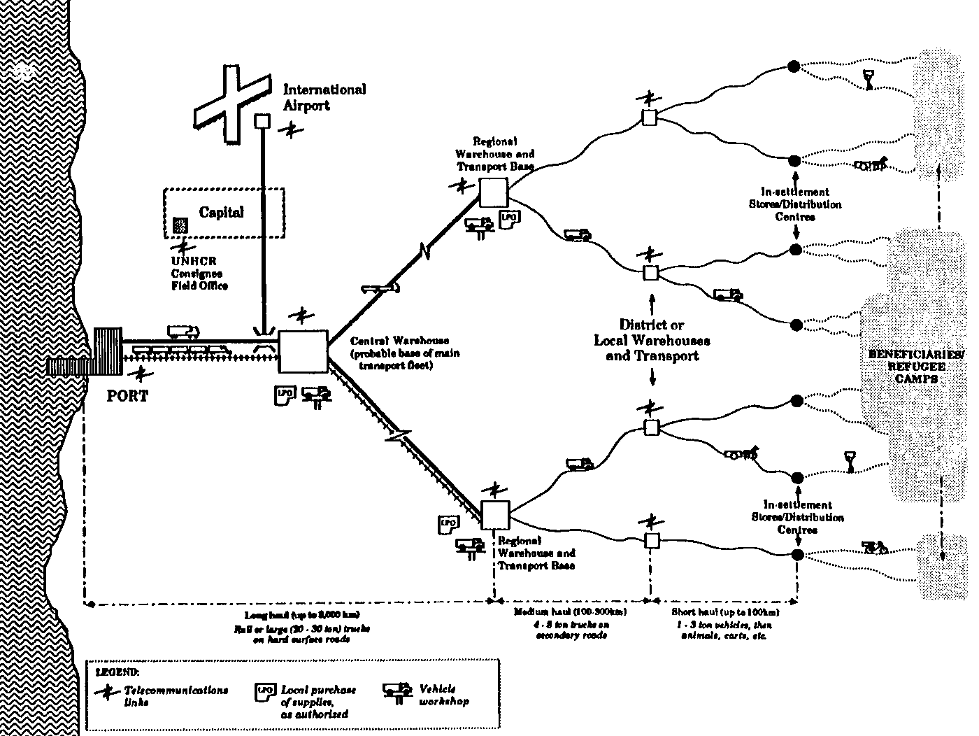5.1.2 Goods supplied from international sources are usually acquired on a C&F (cost and freight) basis, where the supplier is responsible for delivery to the port of entry in the host country. The field logistics system must, therefore, deal with the linear flow of material assistance from the port to the refugee sites. It involves the transportation of supplies and their storage at key transit points, with control throughout the system until they are finally distributed for the benefit of the refugees. The components of the logistics system are:
