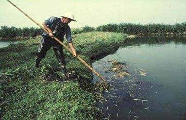 The growth of aquatic weeds, such as this tank with dense Salvinia growth in Sri Lanka, presents specific problems in South and South East Asia, where mosquitoes of the genus Mansonia breed. The larvae of these mosquitoes obtain their oxygen from the air roots of aquatic weeds. They transmit brugian filariasis. Weed control is the obvious solution, but may be hard to achieve on a sufficiently large scale once weeds have invaded a reservoir. In smaller reservoirs, community participation secures permanent weed clearing, provided there is an economic benefit (using the weeds as fodder or fertilizer, for example). Biological control methods have also been tested, using insect pests of weeds, or introducing fish or mammals that consume aquatic weeds.