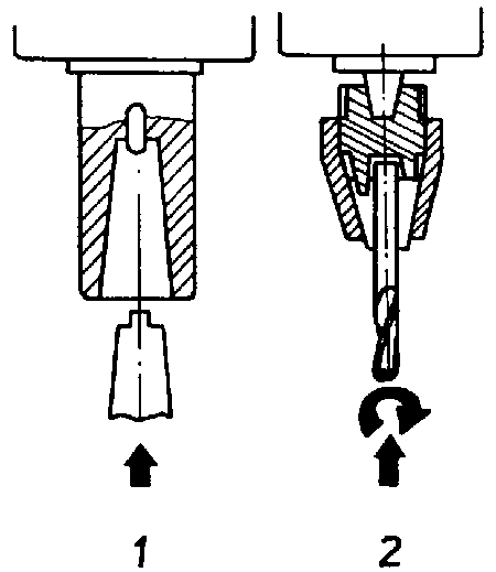 According to the size of the drills (type of the shank), the drills are clamped in a three-jaw chuck or in taper sleeve collets. In mass production, quick-change chucks are often used for the drilling machines, which enables the drill to be changed with the machine running.
