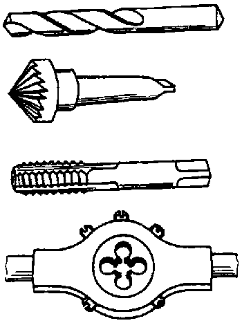There are various kinds of drills, 60° included angle countersinks, cutting dies, serial taps and nut taps for producing through bores and tapped holes. Threading dies are preferred for re-threading screws or threaded bolts.