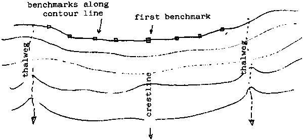 Beginning from the first benchmark, the contour line is found by means of a spirit-levelling board or water level, plotting out a series of points which are on the same level - a procedure which has been explained previously.