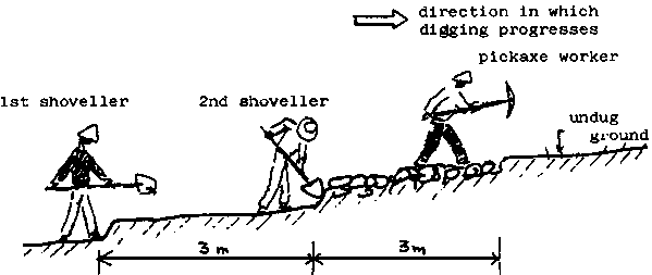 1. The soil is broken up, using the pickaxe, to a depth of about 20 cm and the earth removed by shovel. In a single movement, the earth is thrown by the shoveller to the place where the embankment is to be constructed. A worker is capable of shovelling earth a distance of 3 m in a single throw, on average.