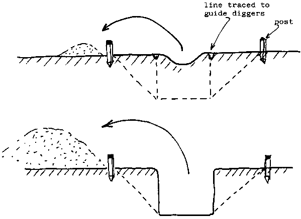 - The plough traces out a furrow along the ground following the layout of the ditches. The operator must be sure to steer the plough exactly along the line of posts of the same colour.- When the first furrow has been completed, the posts are moved across, keeping an equal distance between them, to mark the bounds of the ditch. A second furrow is made, using the posts as a guide. These two furrows mark the boundaries of the ditch. The ground between may then be ploughed to ease the task of digging.