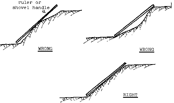 With the middle of the ditch dug to the required depth, the sides will be more or less vertical so, in order to prevent them from caving in, they should be sloped off.
