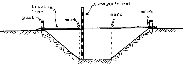 Using a graduated rule, or surveyor's rod, the gang foreman checks the depth of the ditch straight down from the two central marks.