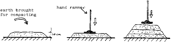 Compaction by hand rammer is achieved in the following way: a 10 cm layer of earth is placed on the bank and carefully packed down by pounding the area with the rammer. Another layer of earth is brought and packed down and so on, until the required height of the bank is reached.