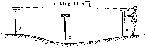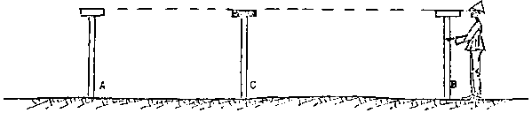 Rod C is moved to various positions between the other two rods, the bank being horizontal when all three are on the same level. If any places along the bank are found to be too low, they should be levelled up with earth and compacted.