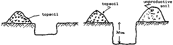 The hole is cube-shaped, at least 30 cm deep and dug out by means of a pickaxe and shovel. The topsoil (to a depth of 20 cm) is placed in a heap to one side of the hole and the remaining 10 cm of earth (unproductive soil) put in a separate heap on the other side.