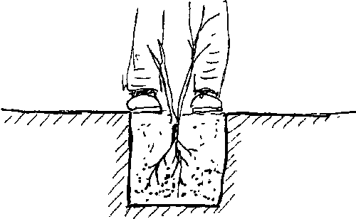 - Place the plant in the hole which has been prepared, so that the collar is a few centimetres above ground level. A stick laid across the hole will help to position the plant correctly. Careful attention must be paid to check that the roots of the plant are not bent under.