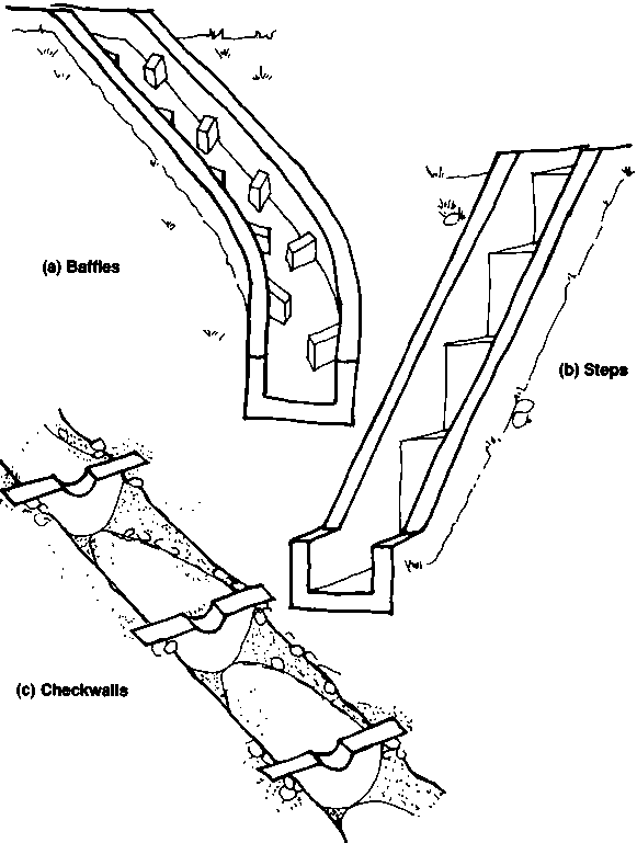 (d) Checkwalls (Fig. 6(c)) are a less expensive solution to the problem, and can be used in unlined drains. The water deposits silt behind each checkwall, gradually building up a stepped drain. The checkwalls should be set well into the ground on each side and beneath them, to ensure that the water does not cut a way past them. In particular, the foundation of each wall should not be higher than the crest of the next one downstream.