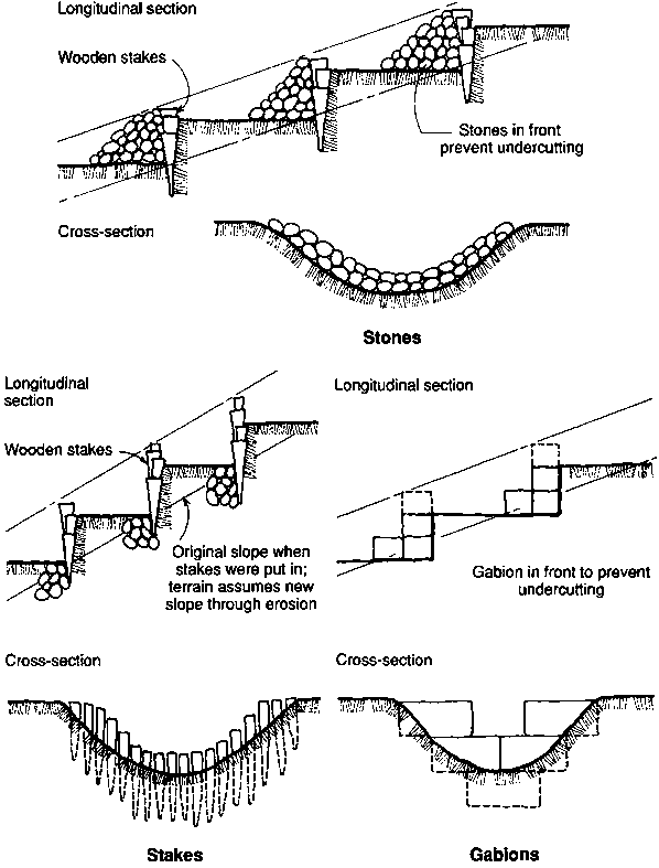 For steep areas, large boulders, preferably at least 30 cm in diameter, can be used to build dissipator checkwalls held in place by wooden stakes (see Fig. 7, page 18). If the boulders are washed away, it may be possible to collect them and pack them in gabions. The spaces between the stones should not be blocked with mortar, as this will only deflect the direction of the water flow, causing erosion at another point. It is better for the water to flow between the stones, dissipating its energy as it does so.