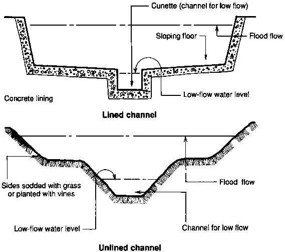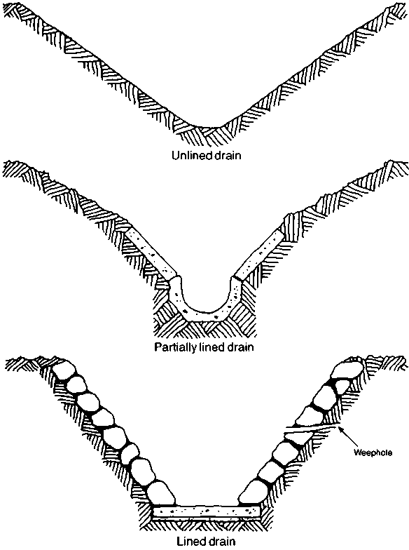 In areas with a moderate ground slope of about 4-10%, drainage channels may be lined with concrete, masonry or vegetation to prevent scouring of the channel bottom. Channel linings are discussed in section 2.6.