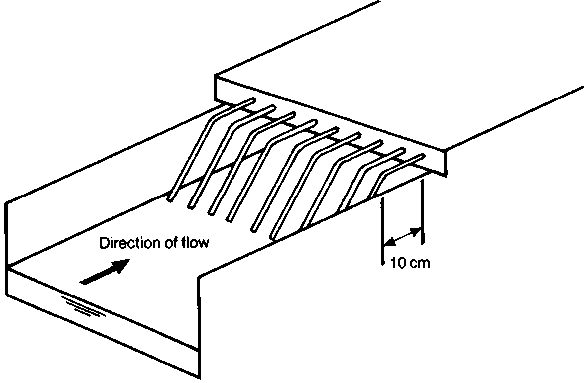 Some short covered sections are almost inevitable, however, at road crossings and under access bridges. An iron grille should be placed at the upstream end of each such section to keep out solids. If these are made as shown in Fig. 10, then it will be easier to remove the accumulated debris by pulling it up the bars with a rake.