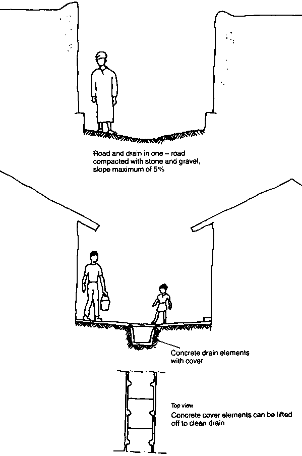 If open channels are built, careful thought should be given to the question of access bridges across them to adjoining properties, for people and vehicles. Without such provision, residents are likely to place stepping stones in the drains, fill them with earth or obstruct them in other ways. The worst option is a drainage system that is partly open and partly closed, so that rubbish thrown into the open section blocks the closed sections, where it is harder to remove. Water dammed up behind the blockage provides a shady stretch of polluted standing water in which mosquitos can breed prolifically.