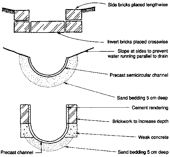 The smallest channels, less than 300 mm deep, do not need weepholes, and can conveniently be lined with brick or with precast concrete elements (Fig. 15). Elements should weigh less than 50 kg, so that they can be carried and laid in place by two persons without machinery. Precast channels should preferably be laid on a bed of compacted sand, 50 mm thick. A single channel size can be adapted for larger flows by laying it deeper and building up the sides with masonry.