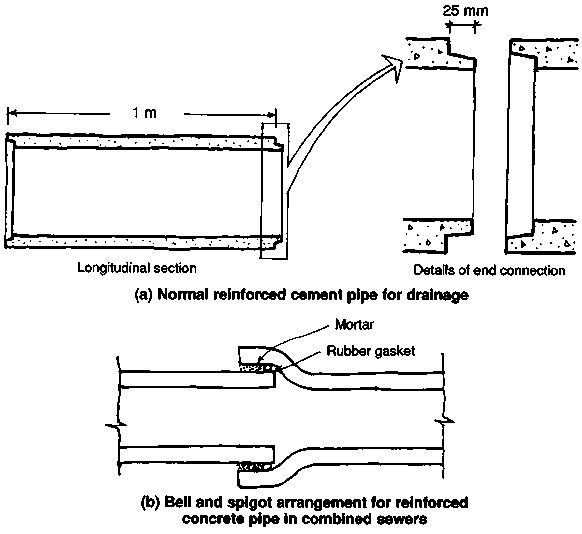 A common type of closed drain is constructed from prefabricated sections of cement pipe, typically 1 m long and 50 mm in diameter. A tongue on the end of each section fits into the next, ensuring that they are properly aligned (Fig. 16(a)). If closed drains are used to convey sewage as well as rainwater the drainage system is known as a combined sewer system, and another kind of pipe connection is normally used to prevent the sewage from leaking out and contaminating the groundwater (Fig. 16(b)).