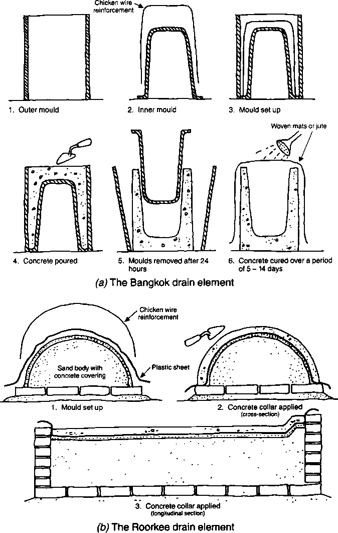 Two simple prefabrication methods are shown in Fig. 17. The first was developed by the National Housing Authority of Thailand and offered to small contractors. The other type of element was designed by the Roorkee Research Centre in India and was intended to form the bottom part of shallow, partially lined drains, although it can be used as a small drain on its own, as shown in Fig. 15. The mould is covered by plastic sheeting or oiled newspapers before the reinforcement and cement mortar are placed on it. A wooden board with a semicircle cut out of it is moved along the channel to ensure that the mortar has the correct thickness.