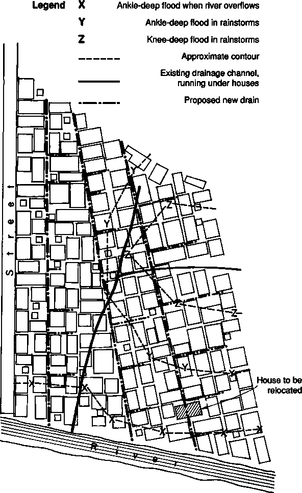 Ideally, a community drainage scheme should be developed with a local authority or other body which has the capacity to provide engineering expertise. However, some communities may wish to undertake some improvements if they prove unable to obtain such technical assistance, or while waiting for it to materialize. This section suggests how they might do so, taking advantage of the residents' ability to monitor the results of their work and make progressive modifications in subsequent years.