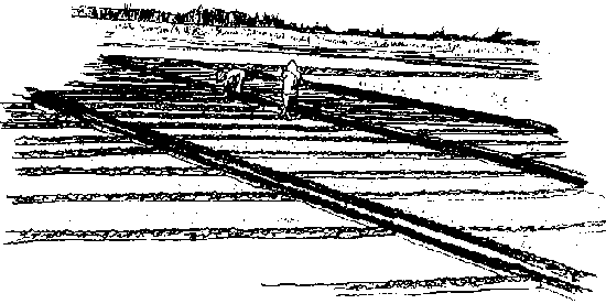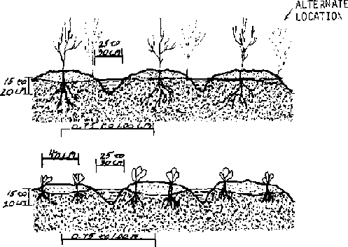 The border system is well adapted to watering forage crops or other crops that cover the ground entirely. Crops normally grown in rows, such as grain or vegetable crops, are more frequently irrigated with furrow systems--a series of furrows and ridges with about 75 to 100 cm between furrows and 15 to 20 cm deep, Figures 10-6 and 10-7. The furrows run downhill, as with borders. Where the furrows are constructed 15 to 20 cm deep, it is possible to irrigate a field with a significant amount of side slope.