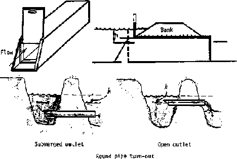 Water may be discharged from the supply channel to the border by gated pipes through the channel berm or by siphons over the berm. Figure 10-5 shows a wooden pipe with control device and a round pipe turn out. Note now the head "h" is measured depending upon whether the pipe outlet is submerged. Table 10-1 shows the capacities of various sizes of wooden pipes of square cross sections. Table 10-2 shows the capacity of round pipes. Table 10-3 shows typical dimensions for border strips.