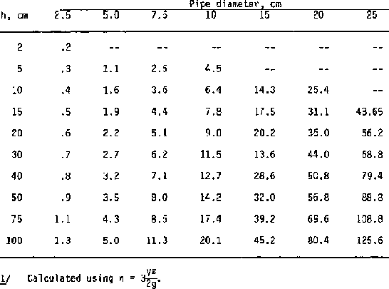 From Table 10-1, a wooden-box field turn-out of 15 x 15 cm with 3 cm head would have more than adequate capacity. It could be closed down after water reached the end of the furrow. From Table 102, a 2.5 cm diameter pipe with 5 cm head would have about the correct capacity. Figure 5-1 shows that maize in Kansas requires about 8 mm of soil moisture per day. In a similar climate, with an application of 110 mm, the irrigation would have to be repeated about each 14 days.