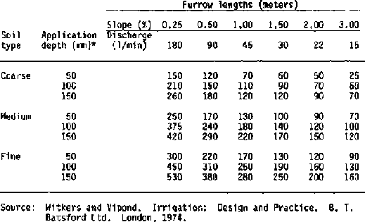 Table 10-4 shows some typical lengths and slopes for furrow systems. Because of the many variables involved, a good operating rule is that water should reach the end of the furrow within 25 percent of the total time for one irrigation. That will provide about 25 percent more irrigation at the top of the field than at the lower end. Water to irrigate a furrow can be applied at a high rate at the beginning of the period and then reduced as the soil becomes wetted. That reduces the time required for water to reach the end of the furrow and prevents excessive loss later from the end of the furrow. Also, a dam may be placed at the end of the furrow to pond water and increase infiltration rate.
