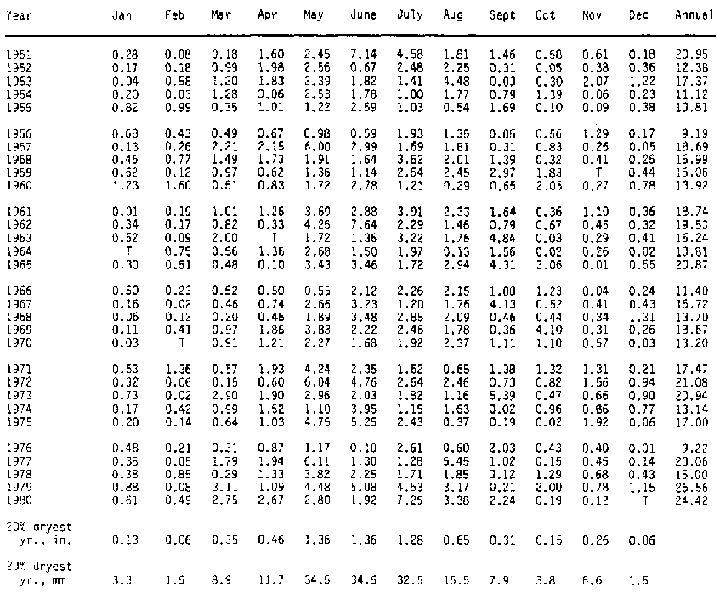 Table 6-1 shows rainfall by month over 30 years for one location. Most irrigation specialists recommend designing a system to provide sufficient water for the wettest of the 20 percent driest years. There should be enough water to produce a crop in the driest year but moisture, rather than plant population or soil fertility, would be a limiting factor. With many years (30) of data available, the 20 percent driest year is found by going down the column for one month and locating the six driest years. For the month of January the wettest of the six driest years is the 20 percent driest year (1957) when precipitation was 0.13 inch; dryer years were 1953, 1961, 1964, 1969, and 1970. The same procedure was followed for the other months with the results shown for each month.