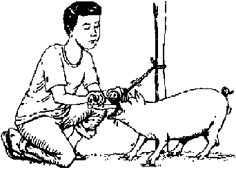 The application of solid preparations through the mouth is called "force-feeding". It is used for ruminants, swine and poultry. The procedure is similar to that for drenching. After you have put the solid medicines into the mouth, make sure that the animal swallows them. In ruminants, this can be done by massaging the throat. An easy way to force-feed animals is to put solid medicines either into a banana or cooked sweet potatoes and feed this to the animal.