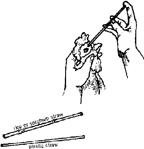 The application of liquid preparation through the mouth is called drenching. It can be used for swine, ruminants and poultry. Hold the head level so that the medicine does not an into the lungs. For swine and ruminants, use a bamboo tube, a softdrink bottle, a wine bottle or a bottle gourd. Use a dropper or straw for poultry.