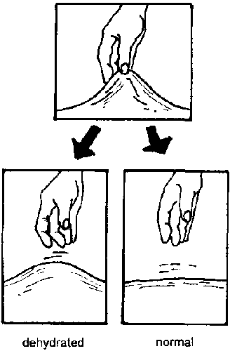 An easy test for dehydration: Raise the skin on the neck between your finger and thumb. If the skin returns to the normal position only slowly, the animal is dehydrated.