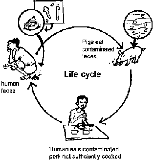 Each of the cysts in the tongue or muscle of the animal contains a tapeworm larva. This is the result of a pig eating human feces containing a whole or part of the tapeworm, or the eggs of the tapeworm. The tapeworm eggs are then absorbed into the intestines of the pig and are carried in the blood system. They are then trapped in the muscle of the animal and develop into larvae which then become cysts. Humans get the tapeworm by eating contaminated pork which has not been sufficiently cooked.