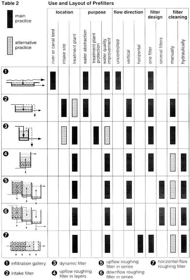 As shown in Table 1, filters can be classified according to filter material size and filtration rate into the following categories: rock filters, roughing filters, rapid sand filters and slow sand filters. Roughing filters, using mainly gravel as filter medium, are operated without chemicals and do not require sophisticated mechanical equipment for operation and maintenance. Nevertheless, their design and application vary considerably. The different roughing filter types are classified according to: