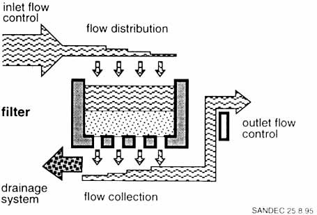 Different installations are required for controlled and adequate filter operation and maintenance. However, the main part of the filter is the section containing the filter material. A filter comprises the following six elements as schematically illustrated in Fig. 25: