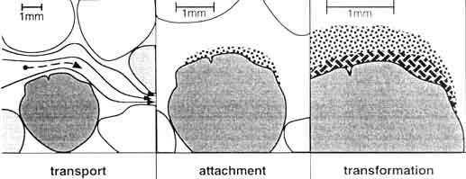 Our puzzled clay particle became aware that his environment was deteriorating during his reflections on filtration. Together with his colleagues he was densely packed in a structure made of decomposing organic matter and hungry microorganisms. The water around them was also foul-smelling. However, this liquid hardly mixed with the water that was flowing gently at a very constant rate and under laminar flow conditions through the filter. The clay particle had the strong urge to dive into this fresh water, or even to swim away.