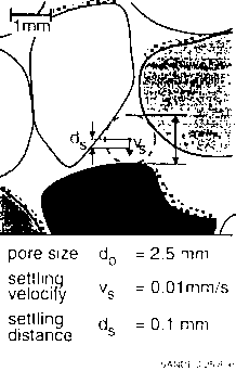 Our floating clay particle wants to settle on the filter medium and desperately calls his friends already resting on the gravel surface for help. He knows that hundreds of million of colleagues have already entered the roughing filter before he started his hopeless journey, and that the filter load (weight of accumulated solids per unit filter volume) has reached a value of 5 g/l. However, the initial filter bed porosity of 35% can only be reduced by 0.25% if his resting clay particle colleagues are packed like sardines. Fortunately, they are building up on the gravel grains and form structured pyramids, thereby increasing the occupied filter volume by a factor 10. As illustrated in Fig. 29, they are thus able to reduce porosity by 2.5%. However, our desperate clay particle is missing his colleagues since the settling distance is still far too big.