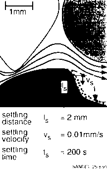 As illustrated in Fig. 30, our old clay particle is also exposed to this flow pattern and hydraulic shear forces which drive him on a twisted trail. He gets thrown off track by these hydrodynamic forces that lead him into a filter compartment with stagnant water where he has time to settle and join his waiting colleagues.
