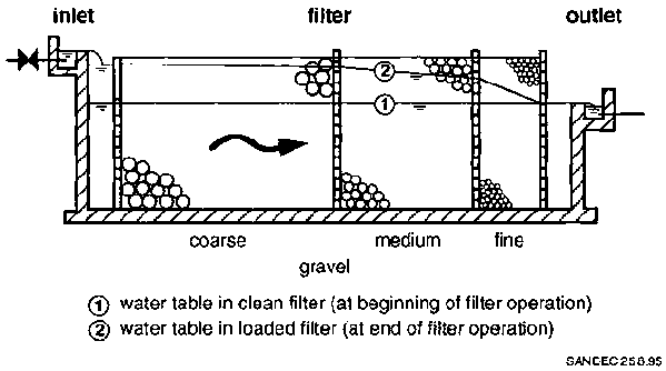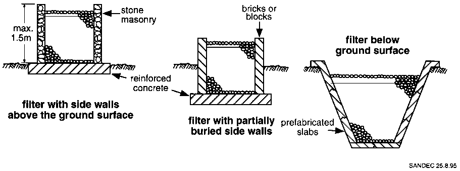 The actual filter consists of a watertight structure containing filter material. The shape of the filter box is normally rectangular and the walls vertical. However, depending on the local construction techniques, circular tanks and inclined walls may also be built. Round river bed gravel or broken stones with sharper edges are generally used as filter material, although any type of inert material resistant to mechanical forces, insoluble, and not impairing the water quality with respect to odour or colour, can be used as filter material.