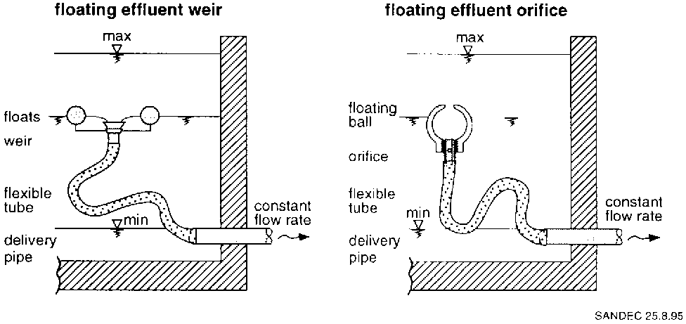 The outlet flow control prevents the filter bed from drying out. Hydraulic cleaning of a dried up roughing filter filled with accumulated solids is a very difficult if not impossible task. Therefore, all roughing filters must be operated under saturated conditions. A weir or a raised and aerated effluent pipe maintains the water above the filter bed level. Furthermore, a V-notch weir might be installed to allow flow rate measurements at the filter outlet.