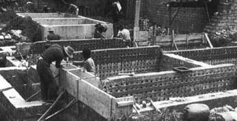 Collection of the treated water also has to be uniform over the entire filter bed. Uneven water abstraction would reduce the overall filter efficiency and create undesirable hydraulic short circuits. Provision of a free water table on top of the filter bed is the best option to achieve even collection of the treated water for upflow filters, or the construction of a false filter bottom (see Fig. 47) for downflow filters. A second but less favourable option is the installation of perforated pipes in downflow filters. For horizontal-flow filters, construction of a perforated wall in the outlet chamber is necessary for even abstraction of the treated water.