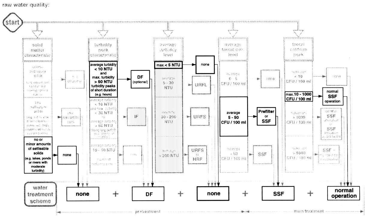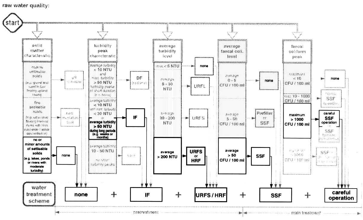 The main objective of roughing filters is the reduction of solid matter in the raw water from a specific, in many cases however unknown concentration, to a level which allows a sound slow sand filter operation. A turbidity value of about 10 20 NTU, or a suspended solids concentration of 2 - 5 mg/l, is generally considered an adequate pretreated water standard for slow sand filtration. Furthermore, since the roughing filters have to treat a certain volume of water per day, a reasonable operational period is necessary between two filter cleanings. Explicitly, roughing filters have to meet the following three design targets: