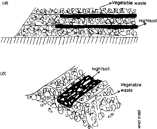 For composting nightsoil, a common method is to place alternate layers of nightsoil (about 50 mm thick) and vegetable waste (about 200 mm thick) in pits or windrows. Fig. A1.2(a) shows how a windrow can be formed to ensure destruction of faecal pathogens by high temperature. Vegetable matter below and at the edges provides some insulation. Fig. A1.2(b) shows an alternative method: after a windrow has been in use for two or three days and the temperature has risen, a trench or pocket is formed in the centre and nightsoil is poured in.