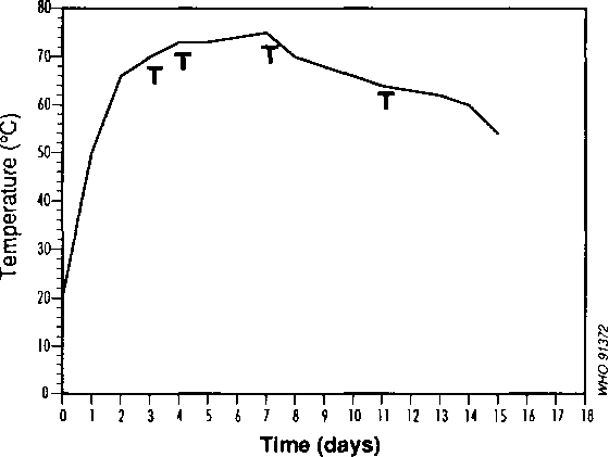 Providing that the material being composted remains aerobic the temperature may rise to 45-50 °C during the first 24 hours. A few days later it will reach 60-70-C, well above the lethal temperature for all pathogenic organisms. Fig. A1.3 shows the variation in temperature during aerobic composting of mixed municipal refuse; the points marked T indicate when the material was turned for aeration.