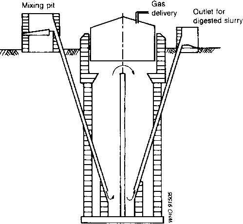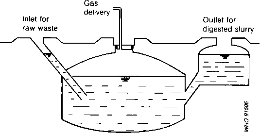Excreta are often mixed with straw or other vegetable waste, such as that used for animal bedding, and equal quantities of water added to make a slurry. This is fed to the inlet side of the chamber. Effluent slurry is removed after a retention time of 30 50 days. Biogas production is greater at higher temperatures. At 30°C the rate of generation of gas is about twice that at 25°C, and little gas is produced if the temperature is below 15 C.