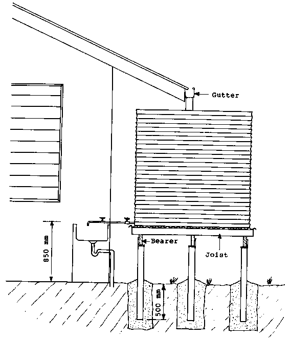 b) Concrete foundation: - Concrete foundations are required where the tank is near ground level and usually associated with a pump, because the outlet will be too low to give pressure to all tapes in the house.