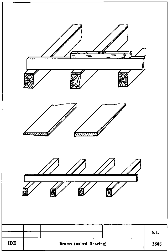 2. Putting the level board across the beams along the wall, checking the beams as to equal height and, by using the water-level, to horizontal position. |