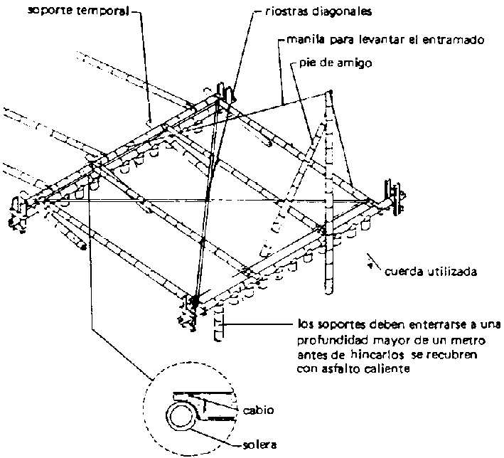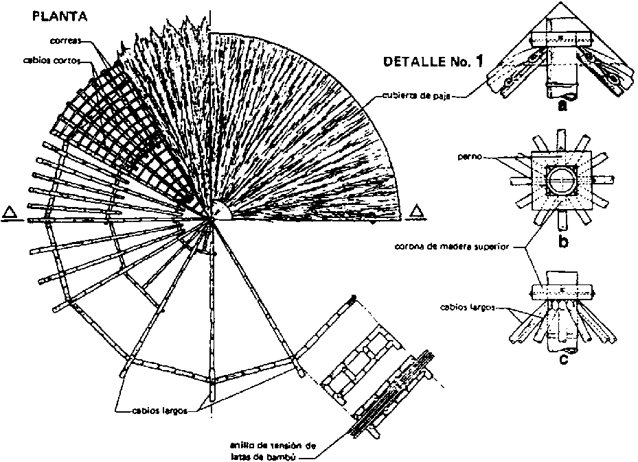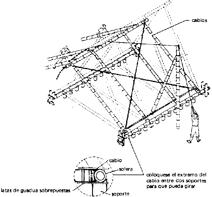 (Estabilidad estructural es lograda con un anillo de tensión en la parte superior de las columnas de bambú).