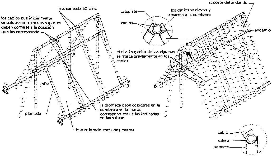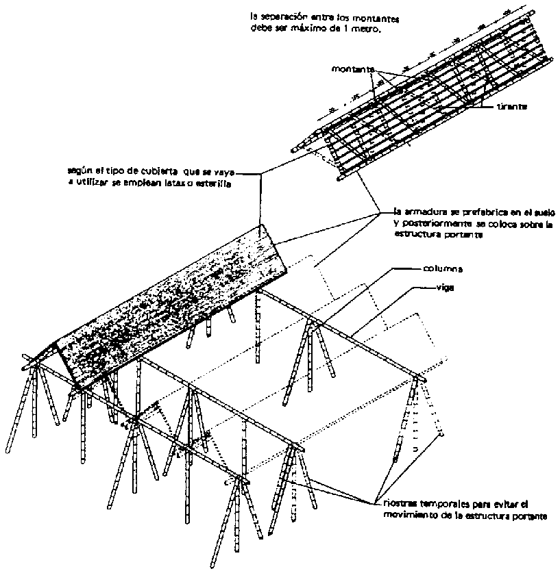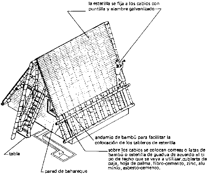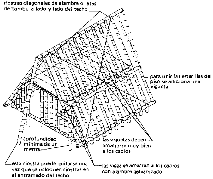 Arriostramiento de la estructura del techo y terminación de la cobertura (primero con bambú partido o listones de madera, fijados con clavos y alambre, después cubiertos con mortero de cemento, mortero de barro estabilizado impermeable o paja).